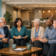 A clean, photorealistic mid-shot of a clinic team huddle with clinicians, a peer specialist, and an operations manager aro...